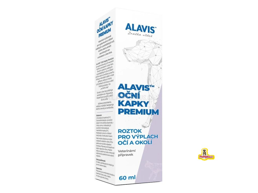 Způsob použití: Veterinární přípravek ALAVIS™ Oční kapky Premium aplikujte jako neředěný roztok. Roztok můžete používat dle potřeby. Aplikujte vždy 1-2 kapky do každého oka 3-4krát denně. Pro důkladnější vyčištění očního okolí navlhčete přípravkem vatový tamponek či gázu a místo vyčistěte. Roztok není třeba oplachovat. Pro výplach je možné použít větší množství objemu.