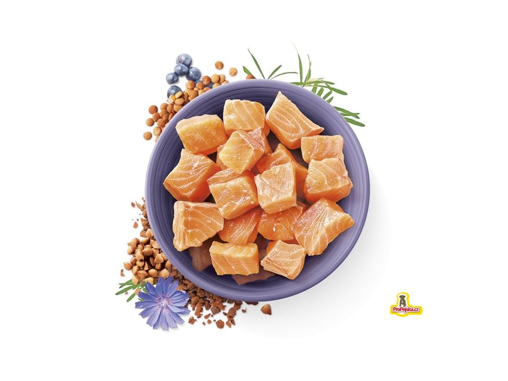 čerstvá ryba (70 %), hrachový protein, červená čočka, pohanka (4 %), přírodní aromata, kuřecí tuk, lososový olej (1 %), chlorid sodný, chlorid draselný, sušená řasa (Ascophyllum nodosum, 0,5 %), protein okřehku (Lemna) (0,5 %), hrachová mouka, sušený rakytník řešetlákový (0,2 %), sušený kořen zázvoru (0,1 %), sušené borůvky (0,1 %), sušený rozmarýn (0,1 %), sušená klikva (vaccinium oxycoccos) (0,1 %), sušený tymián (0,1 %), pivovarské kvasnice (zdroj mannan-oligosacharidů, 0,015 %), kořen čekanky (zdroj frukto-oligosacharidů, 0,015 %), juka schidigera (0,008 %).