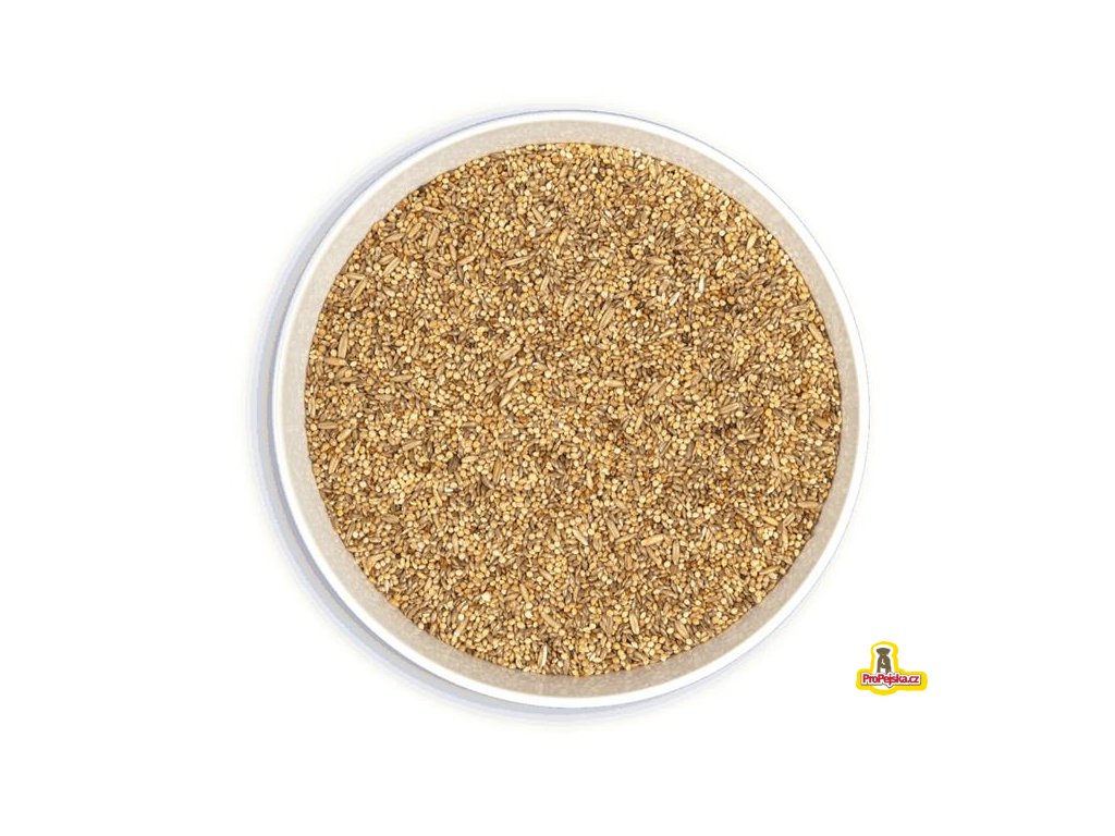 Lesklice kanárská, žluté proso, bílé proso, loupané proso, nahý oves, červené proso, grit z mořských mušlí, žaludeční kaménky, pomerančové aroma, vitaminy.