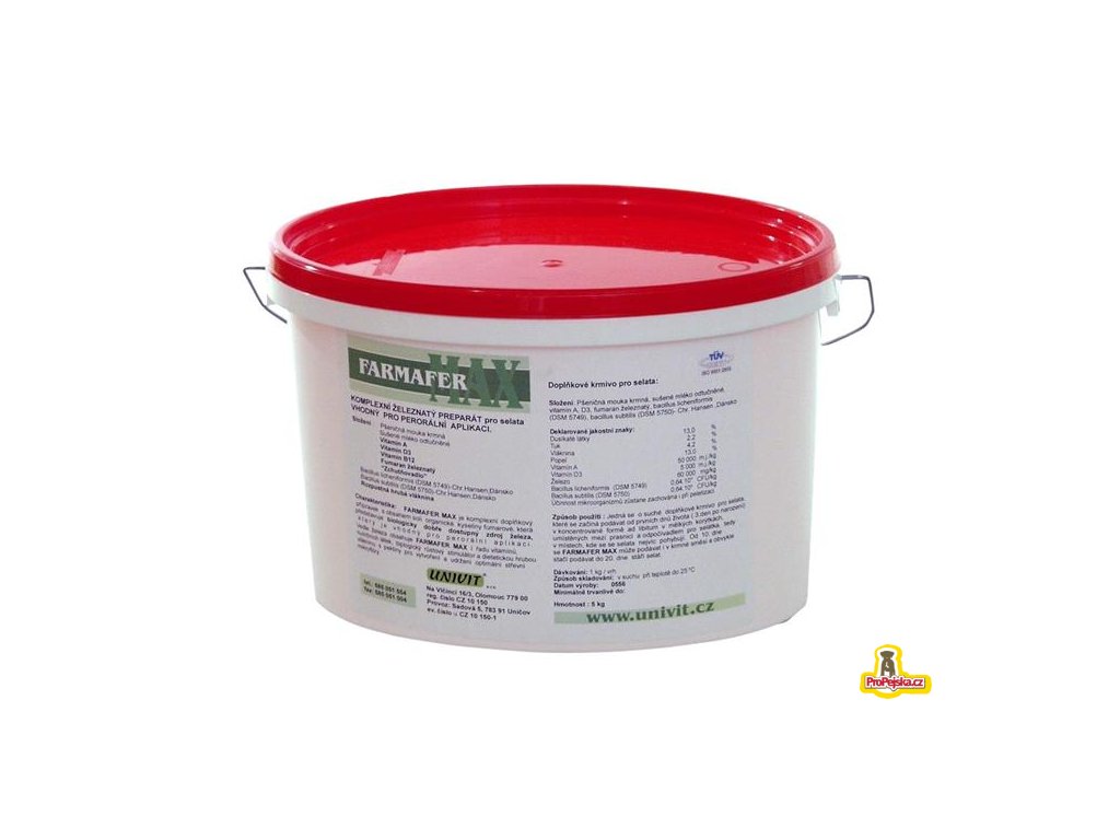 Jedná se o suché doplňkové krmivo pro selata, které se začíná podávat od prvních dnů života (3. den po narození ) v koncentrované formě ad libitum v mělkých korýtkách, umístěných mezi prasnicí a odpočívadlem pro selátka, tedy v místech, kde se selata nejvíc pohybují. Od 10. dne se FARMAFER MAX může podávat i v krmné směsi a obvykle stačí podávat do 20. dne stáří selat.