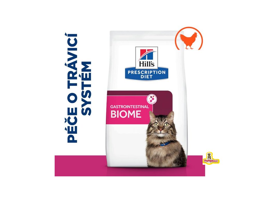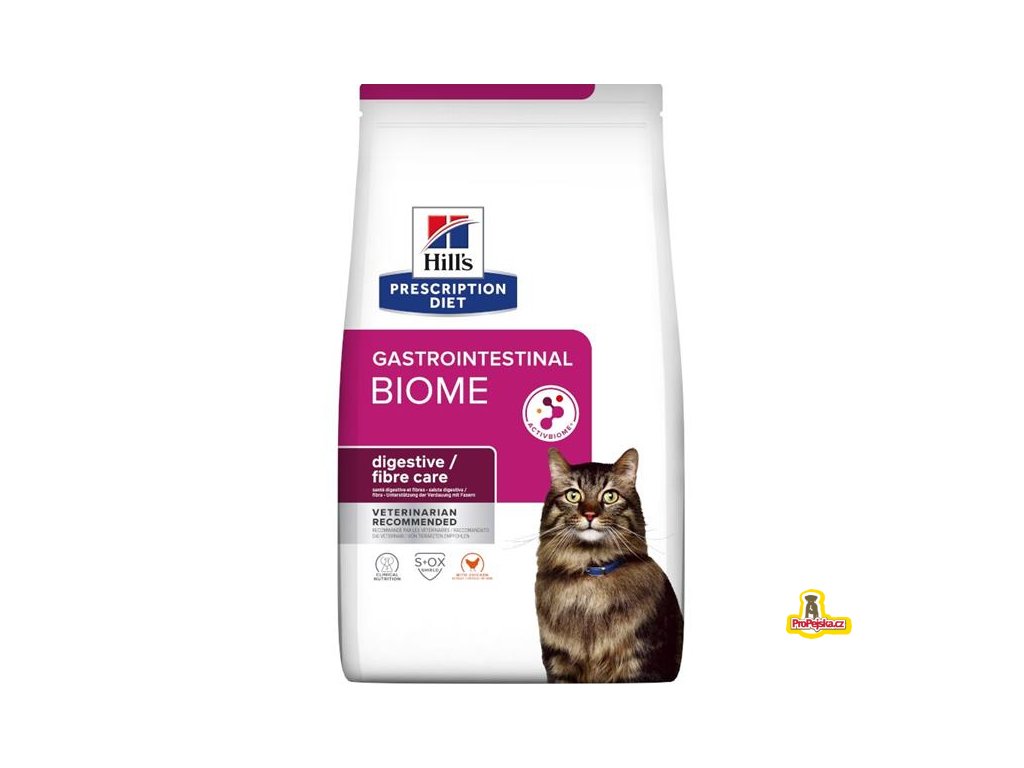 Hill's Prescription Diet Gastrointestinal Biome Digestive/Fibre Care je vyvážené suché krmivo pro kočky se zažívacími obtížemi. Pokrokové krmivo, které podporuje zdraví střev. Kompletní krmivo pro dospělé kočky je připravené z chutného kuřete a dalších snadno stravitelných surovin včetně rýže a kukuřice. Vyrábí se pomocí speciálně vyvinuté technologie ActivBiome+ a obsahuje speciální vlákninovou směs, která přispívá ke zdraví mikrobiomu ve střevě a podporuje pravidelné vyprazdňování. Krmivo pro kočky Hill's Prescription Diet Gastrointestinal Biome je bohaté na omega-3 mastné kyseliny a vyniká svou stravitelnou recepturou. Je zároveň chutné, a proto ho mnoho koček dobře přijímá.