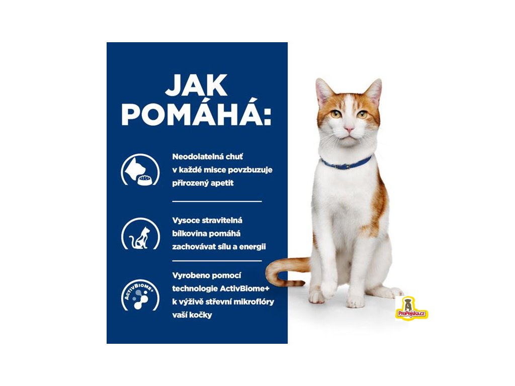 Vysoce stravitelné živiny obsažené v Prescription Diet ON-Care krmivech se snadno vstřebávají a jejich složení zahrnuje také ActivBiome+, což je patentově chráněná směs prebiotické vlákniny, která podporuje zdravý střevní mikrobiom a prokazatelně zlepšuje kvalitu stolice. Poraďte se se svým veterinářem, zda je toto krmivo pro vaši kočku vhodné.