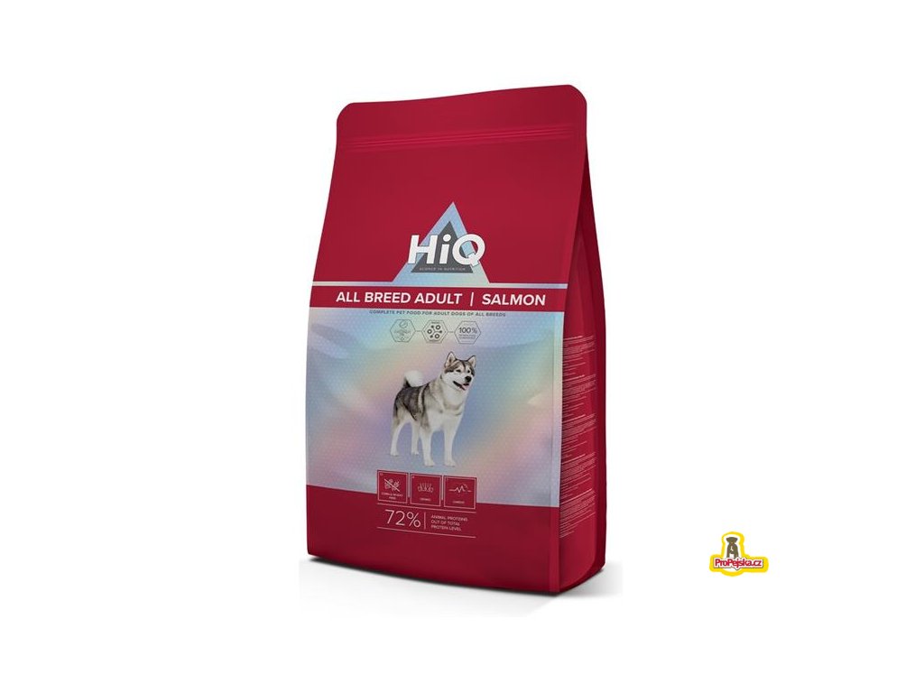 Kompletní krmivo HiQ pro dospělé psy všech plemen s lososem obsahuje vysoce kvalitní bílkoviny z lososa, které zajišťují zachování lesku a hustoty srsti a zároveň podporují zdraví pokožky. Neobsahuje pšenici a kukuřici, proto je vhodný pro psy s citlivým zažíváním nebo trpící nesnášenlivostí lepku. Krmivo napomáhá snadnému trávení a vstřebávání živin. Podporuje zdraví kostí a kloubů a dodává potřebné vitamíny a minerály. Pečuje o správné fungování srdeční činnosti a také o imunitu psa.