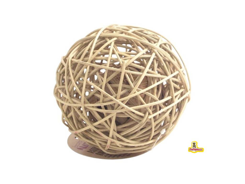 Pletená ratanová koule, uvnitř s kuličkou z listů vodního hyacintu. Hračka pro drobné savce, která zahání nudu a podporuje hlodání, vyrobená ze 100% přírodních materiálů bez použití lepidel, drátů a svorek.