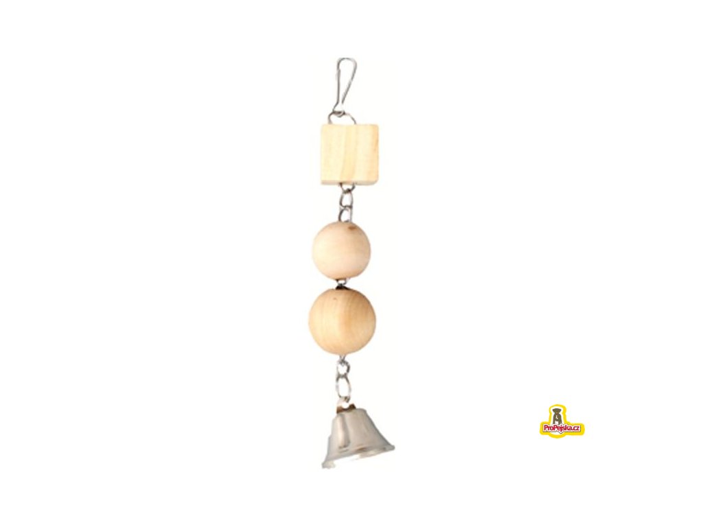 Hračka pro ptáky z kousků dřeva provlečených na kovovém řetízku. Na dolním konci je zavěšený zvonek.