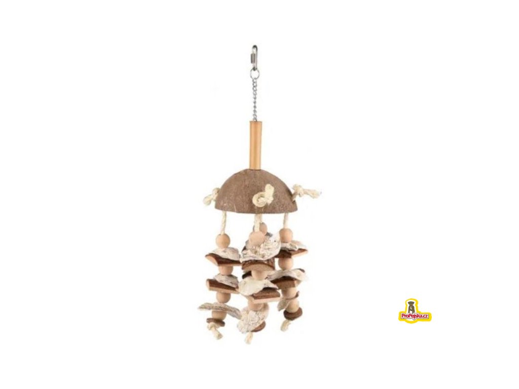 Hračka z přírodních materiálů pro zabavení papoušků v kleci. Kousky dřeva, kokos, lastury a juta jsou ideální pro oštipování a žvýkání. Hračka má kovový závěsný systém pro snadné uchycení ke kleci.