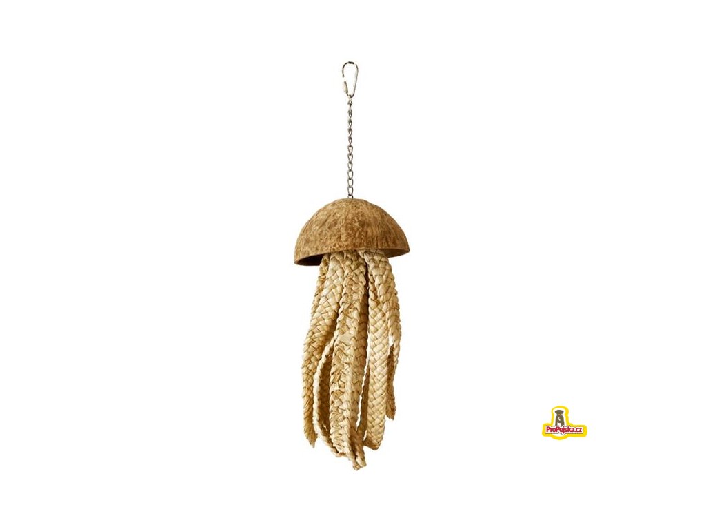 Přírodní hračka Medúza z banánových listů, velikost L je hračka z přírodních materiálů (kokos a banánové listy). Kousek skořápky kokosu tvoří vršek medúzy a chapadla jsou spletená z banánových listů, které jsou ideální na škubání a trhání. Vhodná pro velké papoušky.