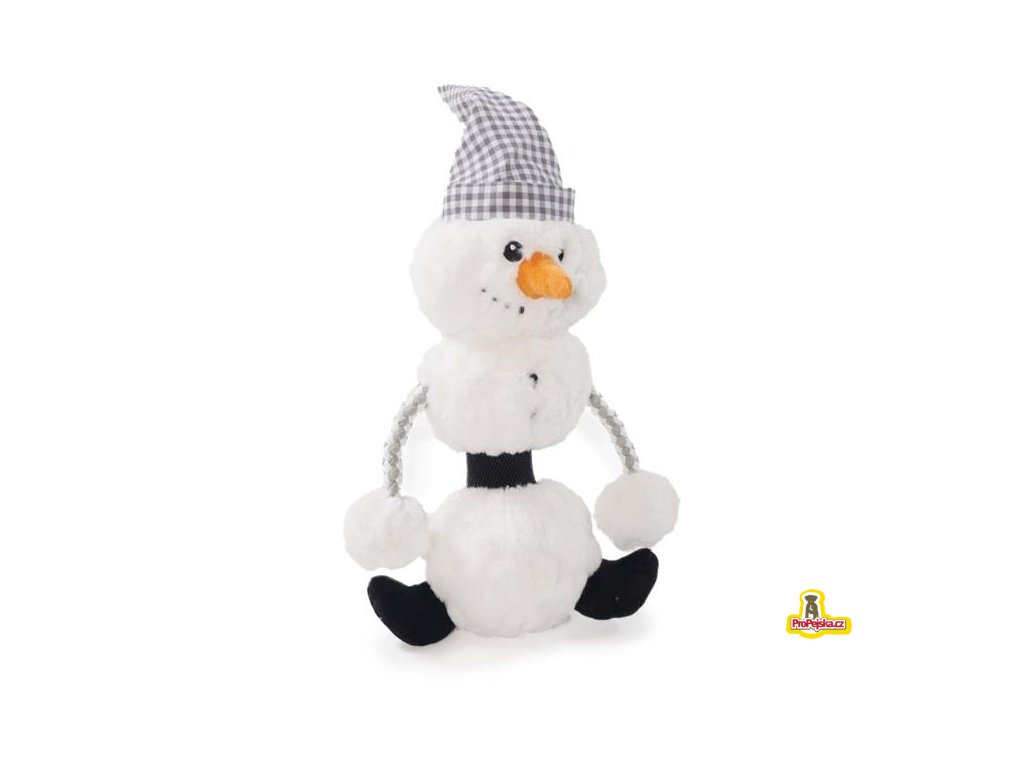 Měkká plyšová vánoční hračka pro psy, která má v těle zabudované pískátko, které láká psa k aktivní hře. Zvrásněné tělo a provazové ruce hračka lze využít k aportování a přetahování.