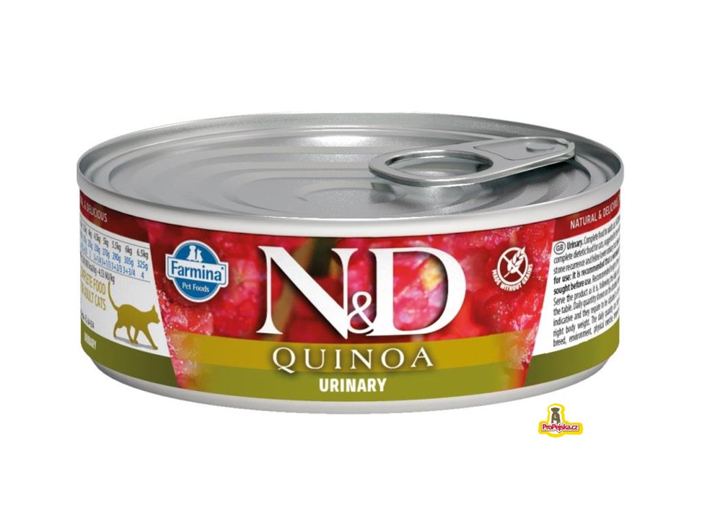 Farmina N&D Quinoa Urinary je krmivo pro zvláštní účely výživy určené k podpoře omezení opakované tvorby struvitových kamenů a onemocnění dolního močového ústrojí koček.