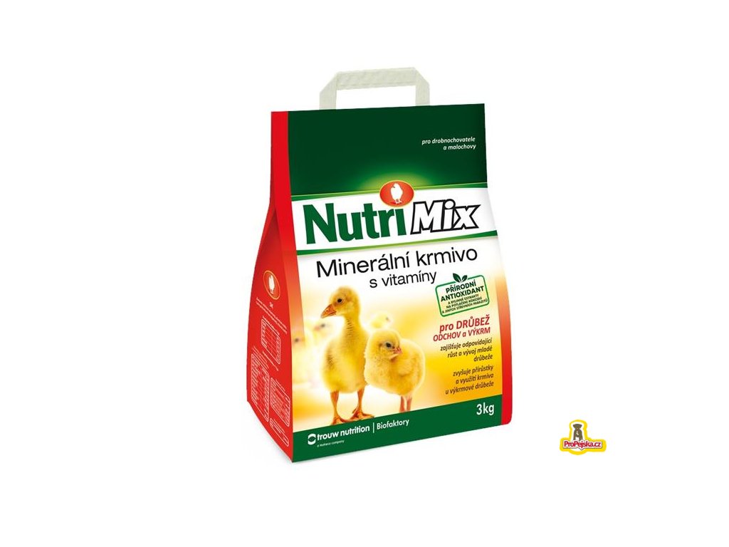 Nutrimix pro drůbež - odchov a výkrm je určen pro doplnění minerálních látek a vitaminů do krmných dávek pro kuřata, kachňata, housata, krůťata a další drůbež chovanou v drobnochovech. Podporuje dosažení maximálních přírůstků, využitelnost krmiv, životaschopnost a dobrý zdravotní stav rostoucí drůbeže. Přidává se do krmné dávky, která je založena na obilných šrotech nebo jiných neplnohodnotných krmivech, popř. kuchyňských zbytcích atd.