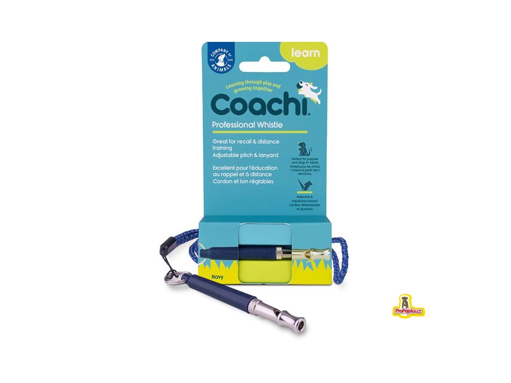 Coachi Professional Training Whistle je píšťalka určená pro profesionální výcvik štěňat a dospělých psů. Umožňuje měnit výšku a intenzitu tónu podle citlivosti psa, pro nácvik různých povelů nebo pro současný trénink více psů. Výška a intenzita tónu se upravuje pootočením matice po rozpojení plastové a kovové části píšťalky. Píšťalka Je lehká, odolná a opatřená reflexním provázkem s nastavitelnou délkou pro pověšení na krk nebo na zápěstí. Má jasný, silný a stabilní zvuk, dobře slyšitelný na dálku.