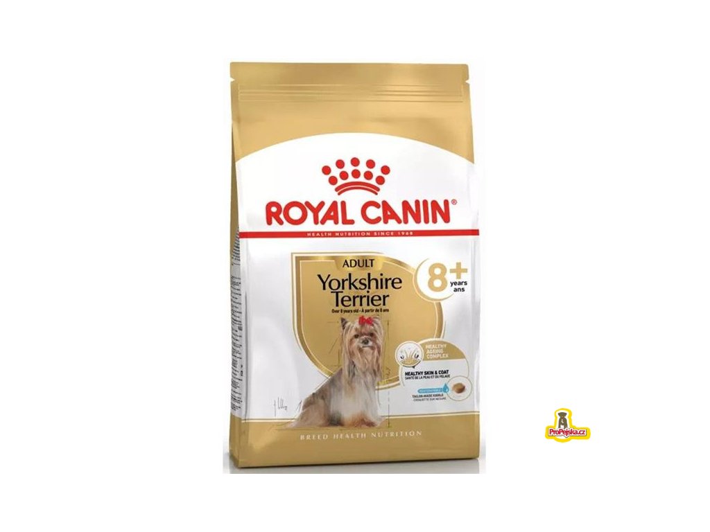 Royal Canin Yorkshire Terrier Adult 8+ je kompletní super prémiové krmivo pro starší čistokrevné jorkšírské teriéry (od 8 let). Krmivo pro psy Yorkshire Terrier Adult 8+ je vytvořeno tak, aby uspokojovalo veškeré nutriční potřeby těchto psích seniorů.