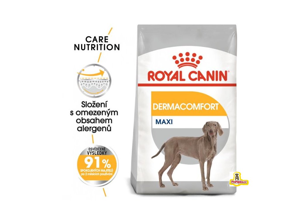 ROYAL CANIN® Dermacomfort Maxi je krmivo upravené na míru s aktivními živinami, které podporují zdravou pokožku vašeho psa. Krmivo je obohaceno o mastné kyseliny omega 3 a omega 6 a pomáhá zklidnit pokožku, která je díky tomu méně citlivá na dráždivé látky v okolním prostředí. Tyto živiny také pomáhají udržovat srst vašeho psa zdravou. Granule pro psy ROYAL CANIN® Dermacomfort Maxi, vhodné pro psy s hmotností od 26 do 44 kg, obsahují speciálně navržené granule, které dokonale vyhovují zubům vašeho psa.