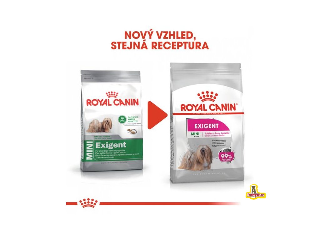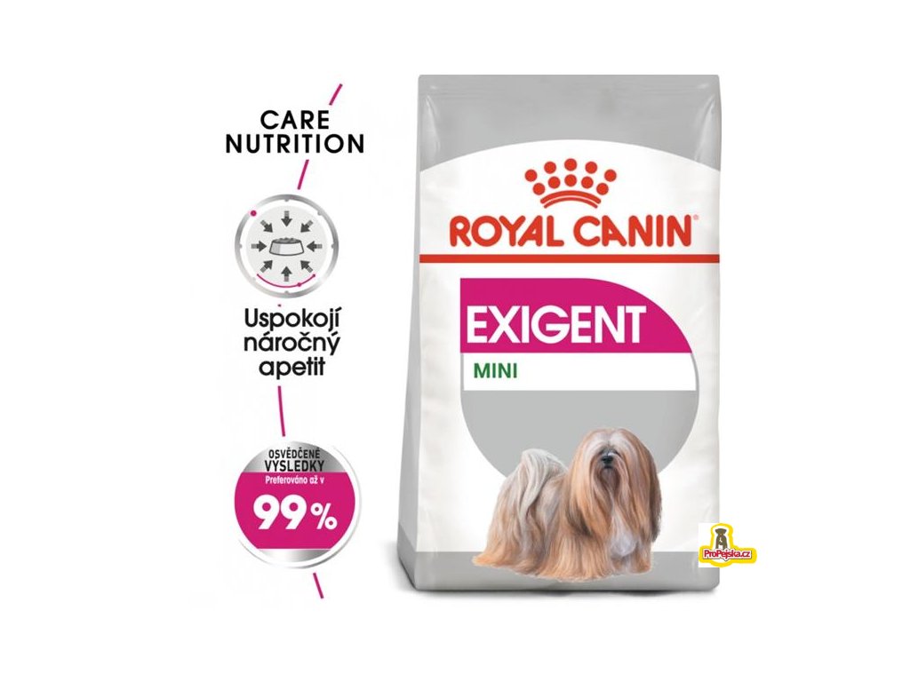Někteří psi malých ras jsou obzvlášť mlsní, což komplikuje výběr krmiva. Časté změny druhu krmiva, upřednostňování určitých ingrediencí a alergie na některé suroviny způsobuje, že se pes stává vybíravým. Proto potřebujete krmivo, které je psy dobře přijímáno a které si psa získá speciálním tvarem granulí-kroketkami- a chutí. Krmivo by mělo být více než jen vyváženým poměrem živin - Royal Canin Mini Exigent podporuje svým složením i zdravou kůži a krásnou srst. Psi menších ras mají menší chrup než zástupci větších ras, jejich zuby jsou těsněji u sebe. Zbytky krmiva se proto mohou usazovat v mezerách mezi zuby, což podporuje vznik zubního kamene. Speciální kroketky s fosfáty sodíku pomáhají chránit před zubním kamenem.