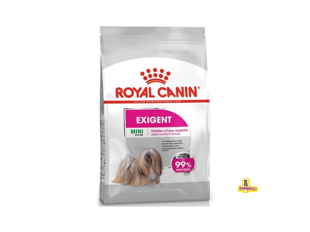 Někteří psi malých ras jsou obzvlášť mlsní, což komplikuje výběr krmiva. Časté změny druhu krmiva, upřednostňování určitých ingrediencí a alergie na některé suroviny způsobuje, že se pes stává vybíravým. Proto potřebujete krmivo, které je psy dobře přijímáno a které si psa získá speciálním tvarem granulí-kroketkami- a chutí. Krmivo by mělo být více než jen vyváženým poměrem živin - Royal Canin Mini Exigent podporuje svým složením i zdravou kůži a krásnou srst. Psi menších ras mají menší chrup než zástupci větších ras, jejich zuby jsou těsněji u sebe. Zbytky krmiva se proto mohou usazovat v mezerách mezi zuby, což podporuje vznik zubního kamene. Speciální kroketky s fosfáty sodíku pomáhají chránit před zubním kamenem.