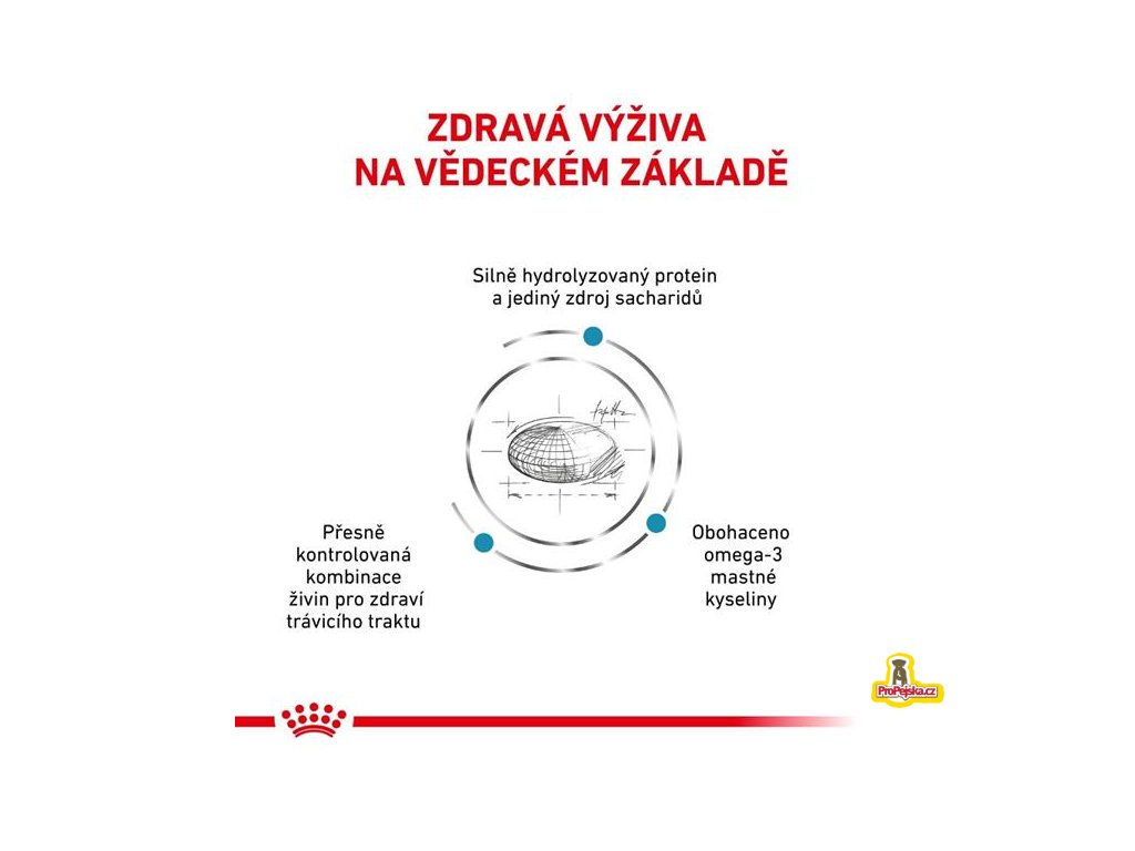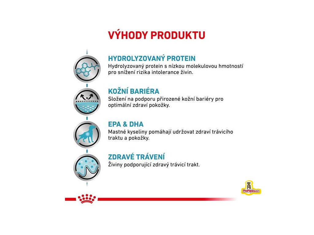 Hydrolyzát proteinového izolátu sóji, tvořený peptidy s nízkou molekulární hmotností, je mimořádně stravitelný a jen velmi slabě alergenní. Silné dávky biotinu, niacinu a kyseliny pantotenové, spojené komplexem zinku a kyseliny linoleové snižují transepidermální ztrátu vody a posilují efekt kožní bariéry. Kyseliny eikosapentaenová a dekosahexaenová, mastné kyseliny s dlouhým řetězcem řady omega-3, zmírňují kožní reakce a přispívají k integritě střevní sliznice. Přídavek fermentovatelných vláken a zeolitu napomáhá správné rovnováze flóry trávicího traktu a přispívá k ochraně střevní sliznice. Krmivo neobsahuje lepek ani laktózu.