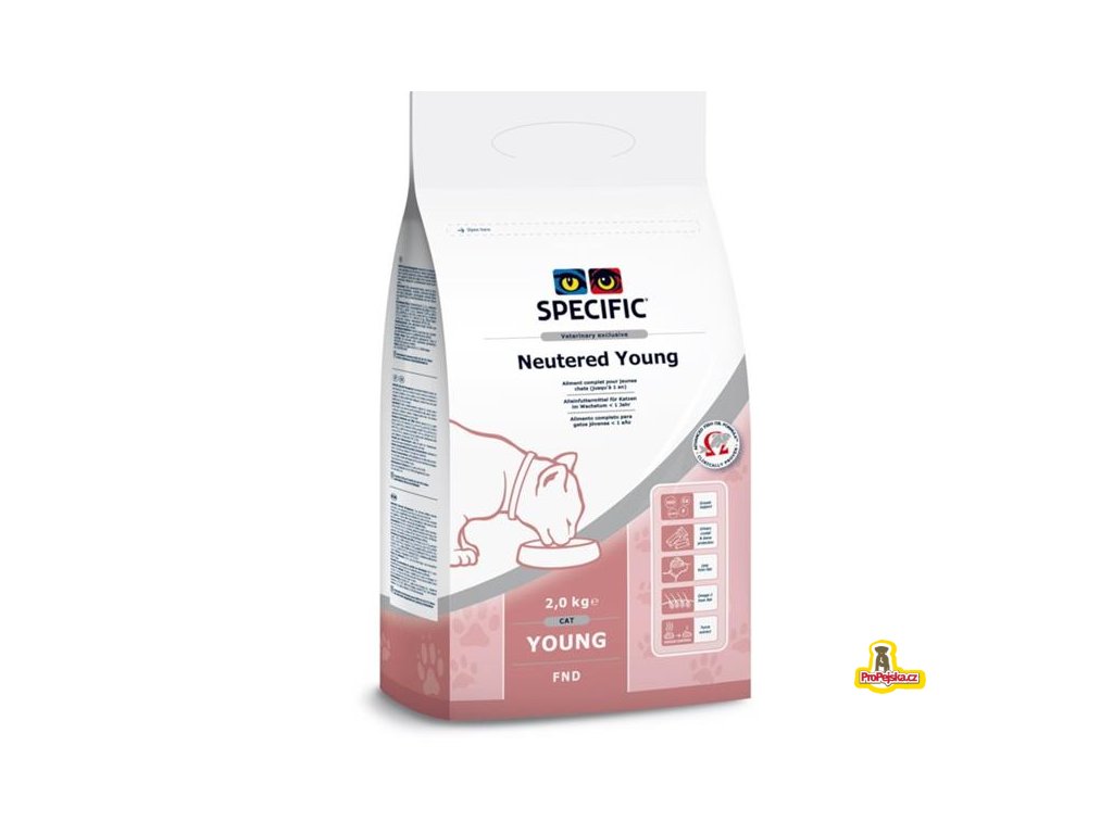 SPECIFIC® Neutered Young je kompletní vyvážené krmivo pro dospívající kočky. Minerální složení a pH moči přispívají k optimální funkci dolních močových cest. Díky tomu je tato dieta vhodná pro mladé kastrované kočky. Toto kompletní krmivo pokrývá veškeré nutriční nároky mladých koček a přispívá k jejich růstu a zdraví.
