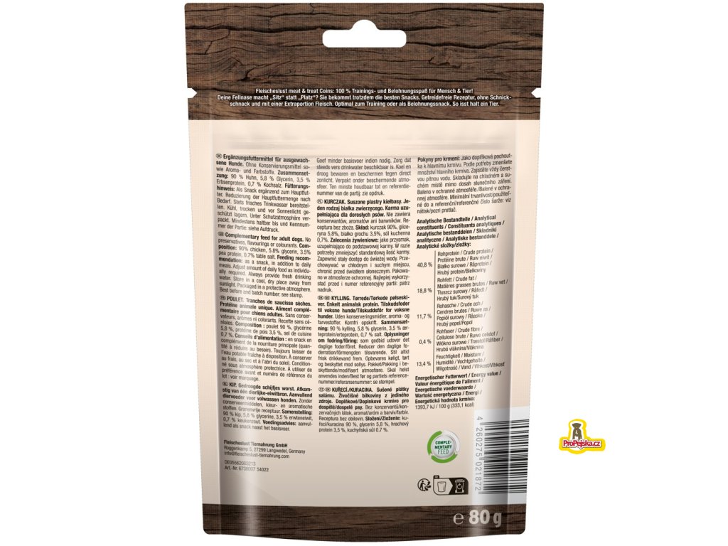 SLOŽENÍ: 90 % kuřecího masa, 5,8 % glycerinu, 3,5 % hrachového proteinu, 0,7 % kuchyňské soli.