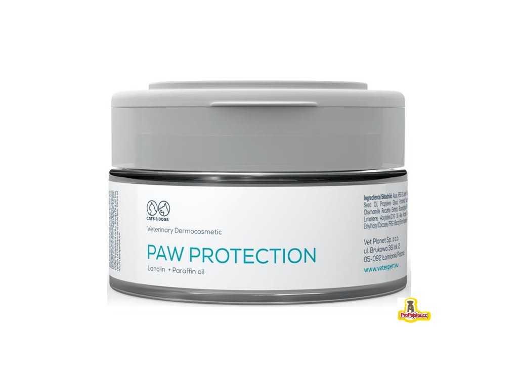 Paw Protection pečující a ochranná mast pro psy a kočky je přípravek určený k péči o choulostivé tlapky zvířete. Chrání během procházek v obtížných povětrnostních podmínkách (jako je mráz nebo teplo) a okolních podmínkách (např. přítomnost štěrku nebo soli v zemi). Díky oleji z čajovníku má mast hořkou chuť, která odrazuje od lízání a umožňuje ji použít k odstranění obvyklého lízání nebo kousání srsti.