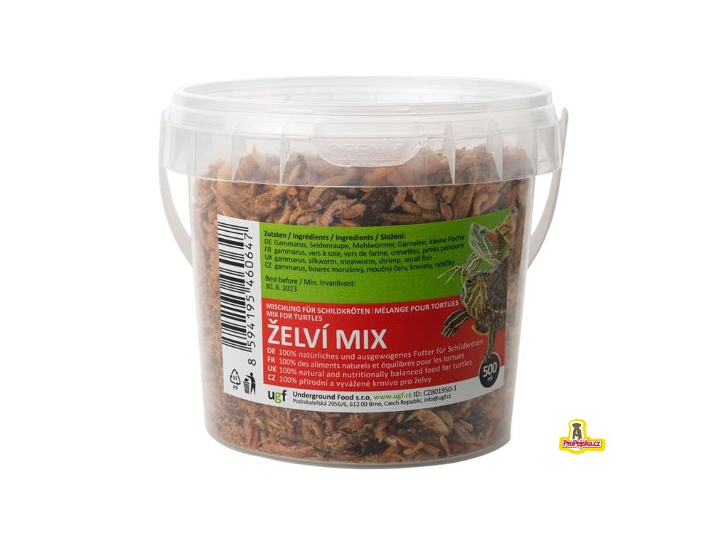 100% přírodní krmivo pro vodní želvy obsahující mix vodních živočichů pro pestrost a vyváženost jejich potravy. Obsahuje gammarus, bource morušového, moučného červa, krevety a rybičky. Díky tomu obsahuje vysoké množství proteinů, vitaminů a minerálních látek, jako je například vápník, pro přirozený růst krunýře a kostí.