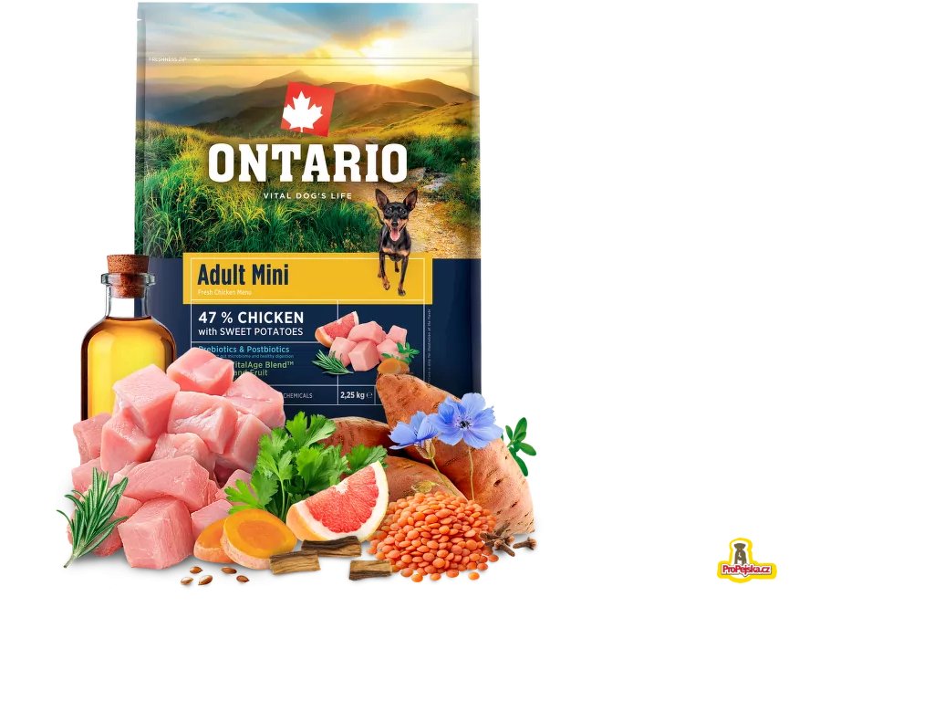 musí splňovat veškeré výživové a nutriční požadavky pro zdravé fungování celého organismu. Proto značka Ontario vyvinula ve spolupráci s veterináři a nutričními specialisty unikátní a výjimečně chutnou recepturu, která poskytuje vyvážené složení a správný poměr všech živin. Kvalitní strava je jednou z nejdůležitějších podmínek pro zdravý a dlouhý život Vašeho psa. Receptura založená vysokým podílu proteinů z kuřecího masa podporujícího vitalitu, kondici a správné zažívání psa a na bramborách, které jsou po tepelné úpravě nejlepším zdrojem sacharidu. S nízkým obsahem obilovin, bez pšenice nebo kukuřice. Jedinou obilovinou je rýže. Krmivo obsahuje speciální mix bylinek a koření, zejména anýz, hřebíček a mořské řasy pro udržení správné ústní hygieny a zdravých zubů.