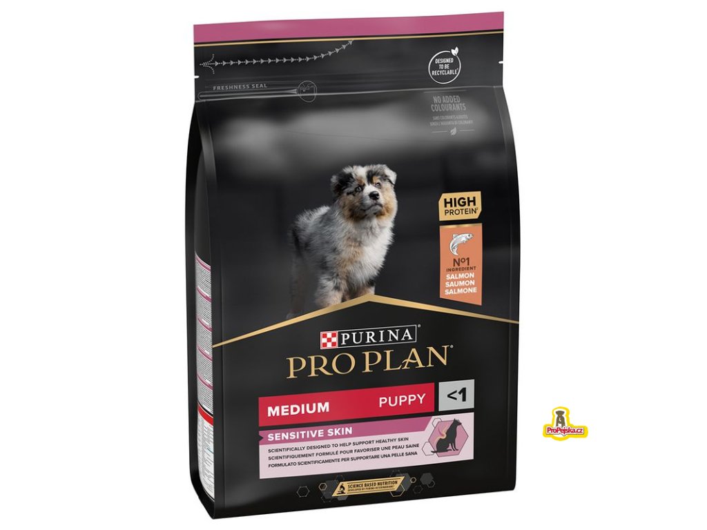 Hledáte krmivo pro štěňata, které je přesně přizpůsobeno potřebám Vašeho domácího mazlíčka? PURINA PRO PLAN Medium Puppy Sensitive Skin (dříve: OPTIDERMA) je vysoce specializované krmivo se složením bohatým na důležité látky, které bylo speciálně vyvinuto pro štěňata středních plemen se sklonem k problémům s kůží a srstí. Chutné suché krmivo je připraveno s velkým množstvím lososa a obsahuje navíc rybí olej jako zdroj cenných omega mastných kyselin, které podporují kůži a srst.