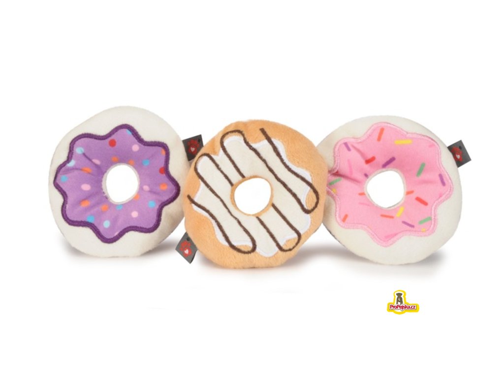 Zábavná hračka pro psy ve tvaru barevných plyšových koblih s pískátkem a je k dispozici ve 3 barvách.