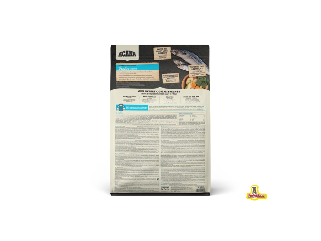 ACANA PACIFICA OBSAHUJE VOLNĚ LOVENÉ SLEDĚ, SARDINKY, PLATÝSE, HEJKY A OKOUNÍKY, DODÁVANÉ ČERSTVÉ NEBO SYROVÉ ZE SEVERNÍHO POBŘEŽÍ OSTROVA VANCOUVER, A NAPODOBUJE TAK PŘIROZENOU STRAVU PSŮ. S NÍZKÝM OBSAHEM SACHARIDŮ A VYSOKÝM OBSAHEM PROTEINŮ Z RYB PRO DOSAŽENÍ VRCHOLOVÉ KONDICE.