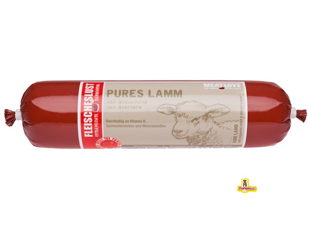 Složení: 80 % jehněčího masa a vnitřností (20 % jehněčího masa, 20 % jehněčí pasty, 15 % jehněčího srdce, 15 % jehněčího bachoru, 15 % jehněčích plic, 15 % jehněčích jater), 15 % neloupaného prosa, pivovarské kvasnice, slunečnicový olej, prášek z vaječných skořápek.