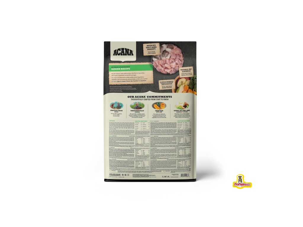 ACANA SENIOR PRO VŠECHNY DOSPĚLÉ PSY OD SEDMI LET VĚKU PŘIPRAVOVÁNO V NAŠICH OCEŇOVANÝCH KUCHYNÍCH V KANADĚ. ACANA SENIOR PŘEKYPUJE ČERSTVÝMI MÍSTNÍMI SUROVINAMI VČETNĚ VOLNĚ CHOVANÝCH KUŘAT, VAJEC Z HNÍZDNÍCH CHOVŮ, PLATÝSE LOVENÉHO VOLNĚ V PŘÍRODĚ A NA SLUNCI ZRAJÍCÍHO OVOCE A ZELENINY – VŠECHNY SUROVINY DODÁVAJÍ VÝŽIVU A CHUTNOST A ZAJIŠŤUJÍ TAK DOBROU KONDICI STARŠÍCH PSŮ. PŘEČTĚTE SI NAŠE SLOŽENÍ A MYSLÍME, ŽE S NÁMI BUDETE SOUHLASIT. SLOŽENÍ: Čerstvé kuřecí maso (19 %), dehydrované kuře (18,5 %), celá červená čočka, celý zelený hrách, dehydrovaná krůta (6 %), čerstvé kuřecí droby (játra, srdce)(5 %), dehydrovaný sleď (4 %), vláknina z hrášku, vejce (4 %), syrový platýs (4 %), rybí olej (3 %), celá cizrna, celá zelená čočka, celý žlutý hrách, hráškový škrob, kuřecí tuk (1 %), syrová krůtí játra (0,5 %), sušená řasa, celá čerstvá dýně, čerstvá celá máslová dýně, čerstvá celá mrkev, celá čerstvá jablka , čerstvé celé hrušky, čerstvá celá cuketa, sušený kořen čekanky, čerstvá kapusta, čerstvý špenát, čerstvé listy tuřínu, čerstvé listy červené řepy, čerstvé brusinky, čerstvé borůvky, čerstvý celý muchovník olšolistý, kurkuma, ostropestřec, kořen lopuchu, levandule, kořen ibišku, šípky.Doplňky (na kg) Technologické doplňky: Extrakt tokoferolu z rostlinných olejů: 121 mg, kyselina citronová: 40 mg. Smyslové doplňky: extrakt z rozmarýnu: 80 mg. Výživové doplňky: 3a890 Cholin chlorid (cholin): 700 mg, 3b606 (Zinek: 75 mg), 3b406 (Měď : 5,5 mg), 3a821 Vitamin B1: 25mg, 3a841 Vitamin B5: 8mg, 3a831 Vitamin B6 : 7,5mg, 3a672a Vitamin A : 7500 IU, 3a671 Vitamin D3 : 1000 IU, 3a700 Vitamin E: 100 IU. Zootechnické doplňky: 4b1707 Enterococcus faecium NCIMB 10415 2,2x10 6 CFU.ANALYTICKÉ SLOŽKY:Hrubý protein 33 %Obsah tuku 14 %Hrubý popel 7 %Hrubá vláknina 6 %Vlhkost 12 %Vápník 1,5 %Fosfor 1,1 %Omega- FA 2,2 %Omega-3 FA 1 % DHA /EPA 0,3 % / 0,3 %OBSAH KALORIÍ (vypočítaný): Vstřebatelná energie je 3325 kcal/kg (399kcal na odměrku (120g). Kalorie k podpoře špičkové kondice jsou dodávány: 35 % z bílkovin, 29 % ze sacharidů a 36 % z tuků.VYROBENO V KANADĚ. Champion Petfoods LP, 52432 Highway 60, Acheson, Alberta, Canada, T7X 5A6, EU REG: PF-29. DOVOZCE: Miroslav Weber – Mlýn, Masarykova 159, 268 01 Hořovice, orijen@acana.cz, Tel.: 311 514 300, Reg. číslo: CZ 800074-01, číslo šarže, registrační číslo kuchyně a minimální trvanlivost: viz horní část pytle. Uchovávejte v chladu a suchu. Dávkování:viz informace na obalu.
