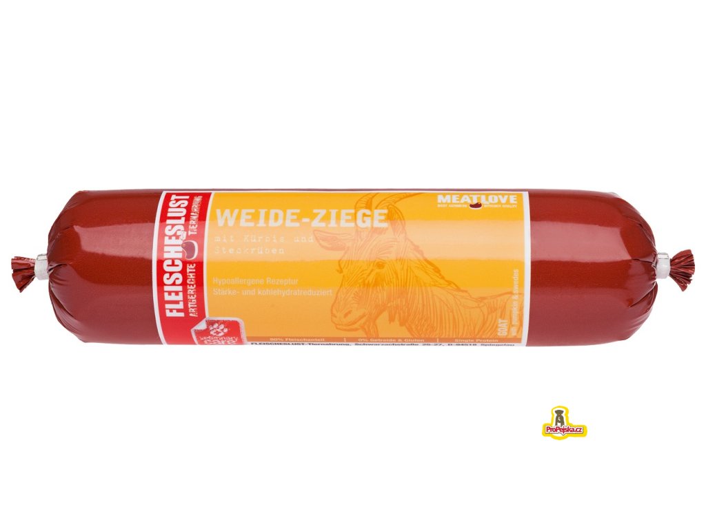Složení: 80 % kozí maso a vnitřnosti (50 % kozí maso, 20 % kozí srdce, 15 % kozí plíce, 15 % kozí játra), 9 % tuřín, 8 % dýně, 2 % šípky, 1 % tymián.
