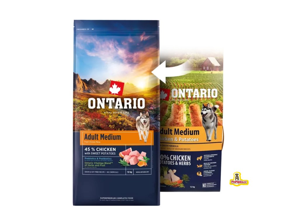 Ontario Adult Medium Chicken & Potatoes 12 kg + Sušené maso 70 g