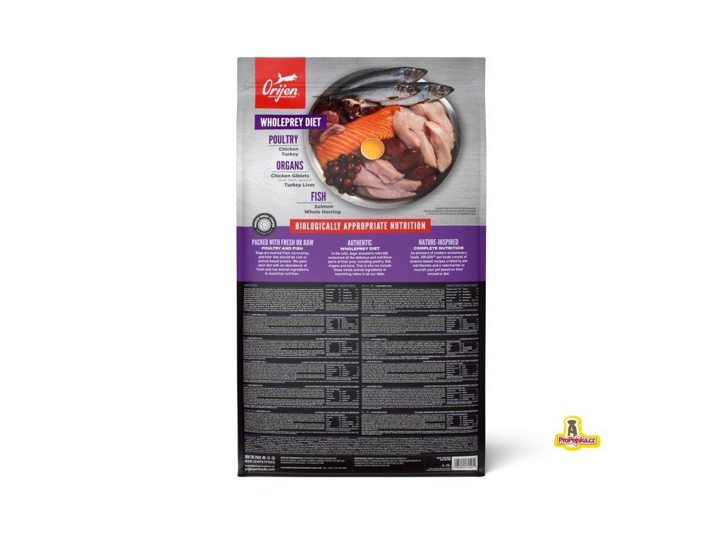 SLOŽENÍ: Čerstvé kuře (29 %), čerstvé kuřecí vnitřnosti (játra, srdce, žaludek) (6 %), syrová krůta (6 %), syrový losos (5 %), celý syrový sleď (5 %), dehydrované kuře (5 %), dehydrovaná treska (5 %), dehydrované sardinky (5 %), dehydrovaná krůta (5 %), dehydrovaný sleď (4,5 %), celá červená čočka, celý hrách, čočková vláknina, syrová krůtí játra (4 %), čerstvá vejce (4 %), celá zelená čočka, celá cizrna, celé fazole pinto, celé fazole navy, sušená jablečná vláknina, olej z hlubokomořských bílých ryb (0,5 %), kuřecí tuk (0,5 %), dehydrovaná kuřecí játra (0,5 %), sušená mořská řasa, celá čerstvá dýně, celá čerstvá máslová dýně, celá čerstvá mrkev, celá čerstvá jablka, celé čerstvé hrušky, celá čerstvá cuketa, sušený kořen čekanky, čerstvá kapusta, čerstvý špenát, čerstvá tuřínové listy, čerstvé listy z červené řepy, celé brusinky, celé borůvky, celé plody muchovníku, kurkuma, ostropestřec mariánský, kořen lopuchu, levandule, kořen proskurníku, šípky.