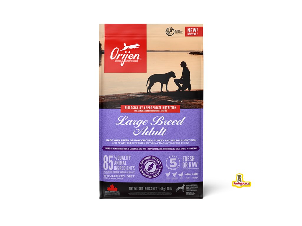 Psi velkých a obřích plemen jsou náchylní k problémům s klouby. Potřebují živiny, které podporují zdraví kloubů. NOVÝ ORIJEN™ Adult Large Breed je vytvořený na míru výživovým potřebám psů velkých plemen skrze kvalitu surovin v poměru celé kořisti. Obsahuje méně tuku a kalorií, protože počítá s pomalejším metabolismem. Je dostupný v balení 11.4kg a obsahuje 85 % kvalitních živočišných ingrediencí a nedává tak prostor žádným plnidlům jako je kukuřice, pšenice nebo sója. Tato receptura vašeho psa vyživuje naplno.